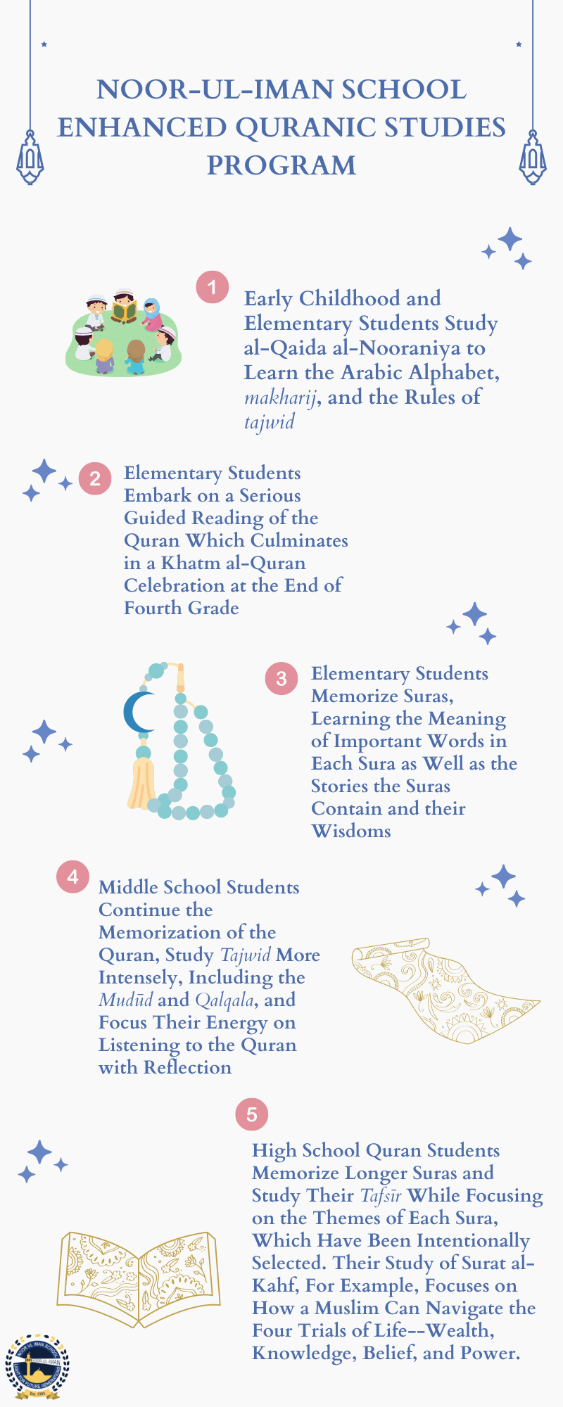 The scholars, in collaboration with NUI teachers, redesigned the Quran curriculum to allow more memorization in the younger years and lead into understanding Quranic science and Tafseer as students become developmentally ready. Students are expected to master proper recitation and tajweed by the end of elementary school as the curriculum requires mastery of makharej (articulation points of the Arabic letters) and tajweed (application of quranic recitation rules) while they memorize a series of surahs. The students also focus on tafseer, understanding the meaning and the morals of the surahs.