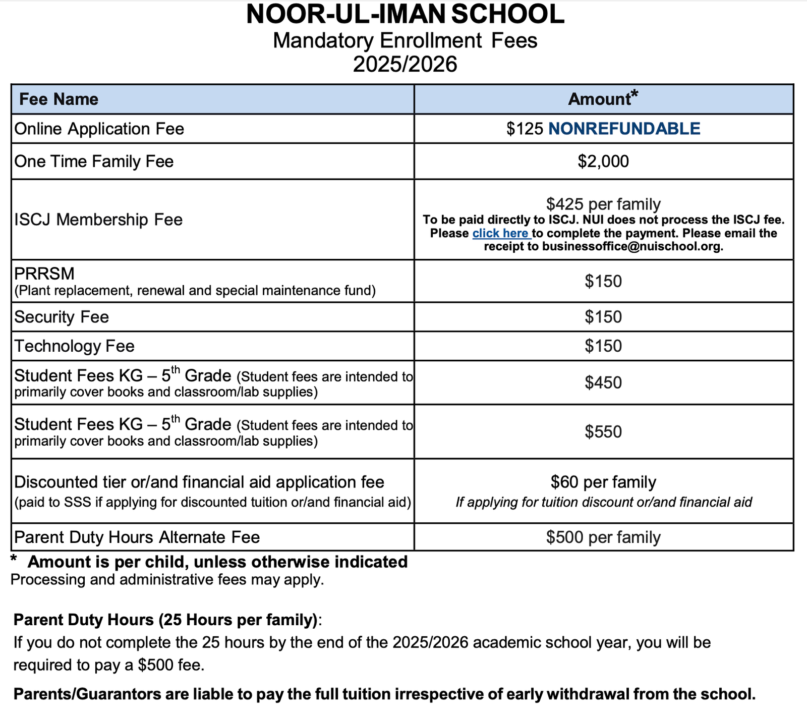 The cost of education varies according to the student’s grade level, however, all of our families are eligible for financial aid & discounts. Noor-Ul-Iman School is committed to finding ways to help keep tuition affordable for NUI families. A Noor-Ul-Iman education represents an investment in your child’s future, and we recognize that choosing an independent school education requires a significant commitment to financial planning. Due to fundraising, applications for grants, and scholarship programs, we have been successful in making our program affordable to the families of our community.